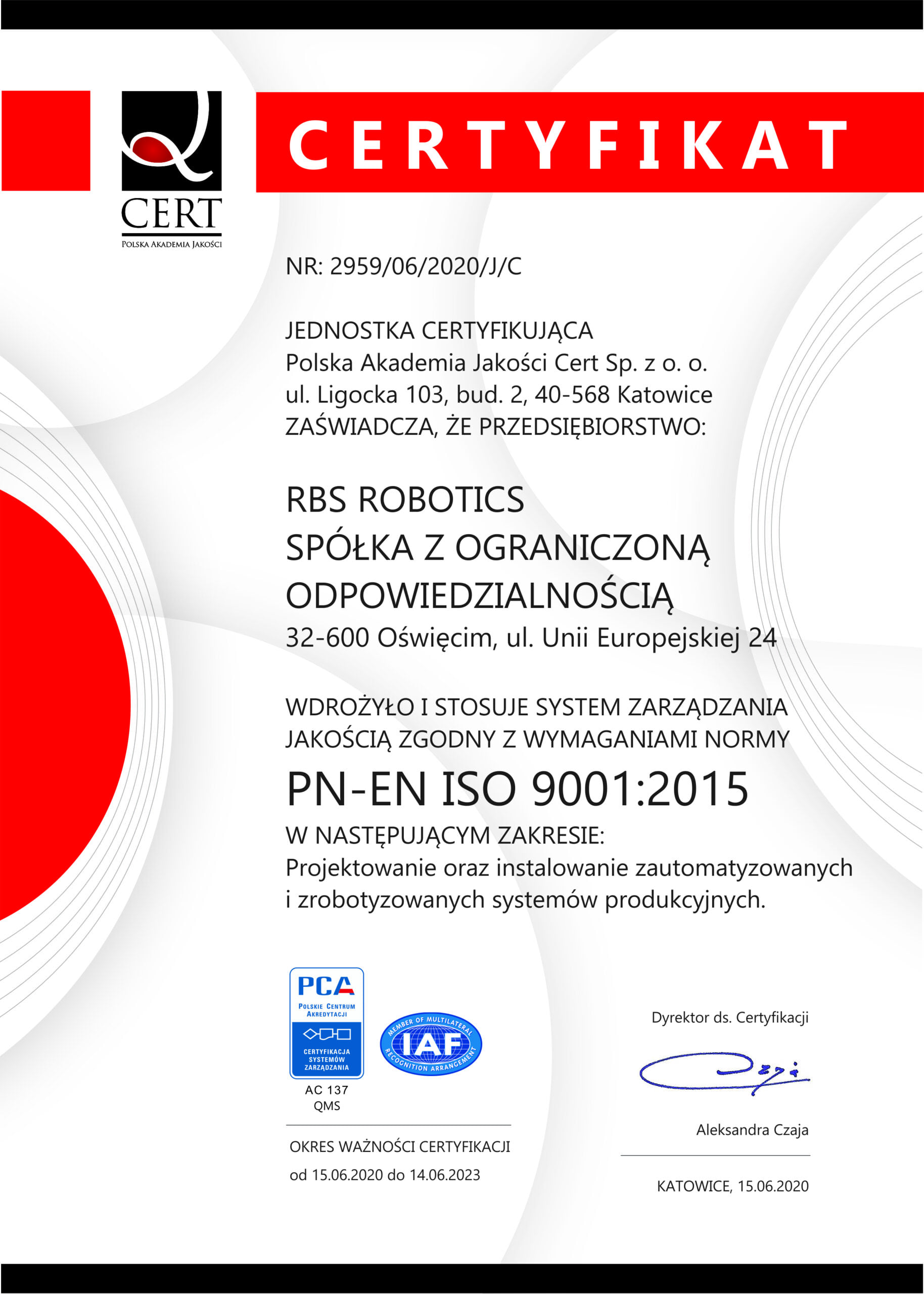 W 2019 roku Zarząd Spółki RBS Robotics podjął decyzję o wdrożeniu w firmie systemu zarządzania jakością zgodnego z wymaganiami normy ISO 9001. Podjęto to wyzwanie, by potwierdzić codzienne działania wszystkich pracowników w tym zakresie, oraz aby uwiarygodnić nasze starania wśród naszych dotychczasowych i potencjalnych Klientów. Certyfikat, po pomyślnie przeprowadzonym audycie, został nam nadany w czerwcu 2020 roku.
