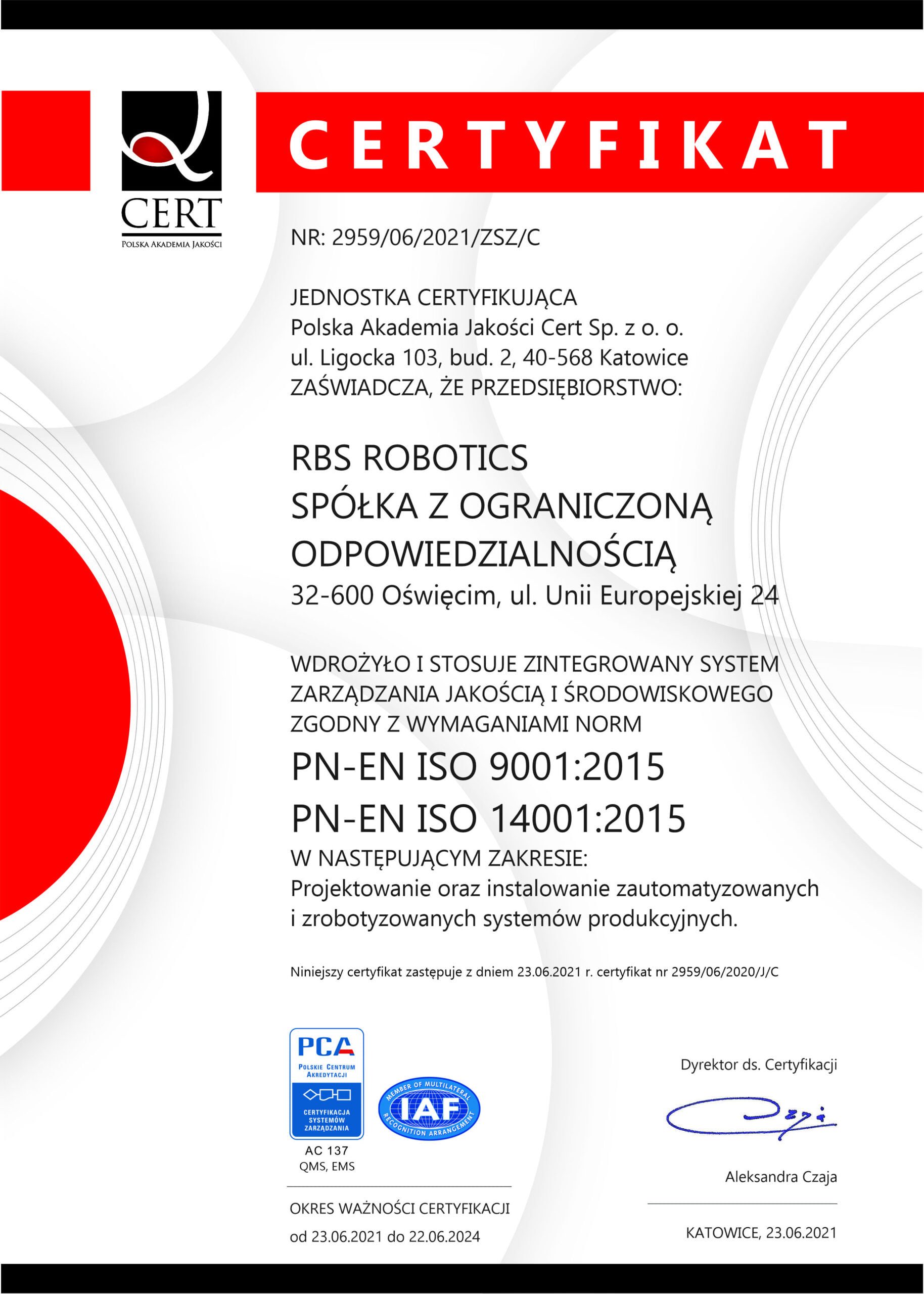 Aby dopełnić system zarządzania, niedługo po otrzymaniu certyfikatu jakości ISO 9001, rozpoczęliśmy starania o uzyskanie kolejnego z zakresu zarządzania środowiskowego ISO 14001. Nasze starania zwieńczone zostały sukcesem po audycie przeprowadzonym w czerwcu 2021 roku otrzymaniem Certyfikatu Zintegrowanego Systemu Zarządzania Jakością i Łšrodowiskowego zgodnego z wymaganiami norm ISO 9001 i ISO 14001.