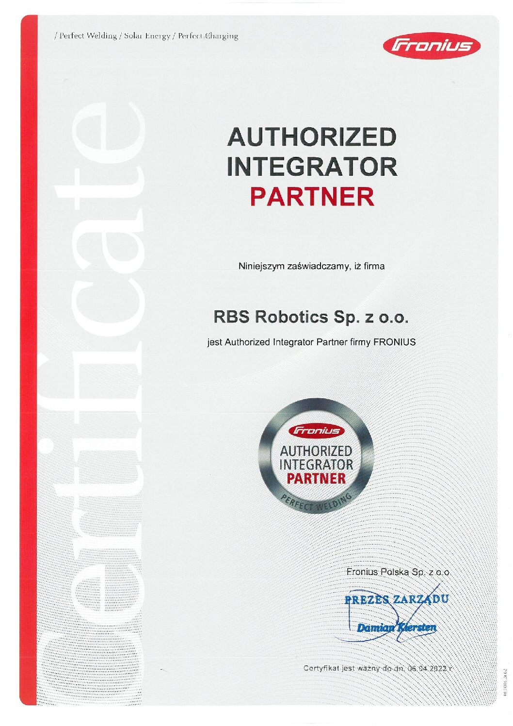 Certyfikat programu partnerskiego dla RBS Robotics, świadczy o doskonałej znajomości przez naszych specjalistów, standardów oraz systemów FRONIUS.