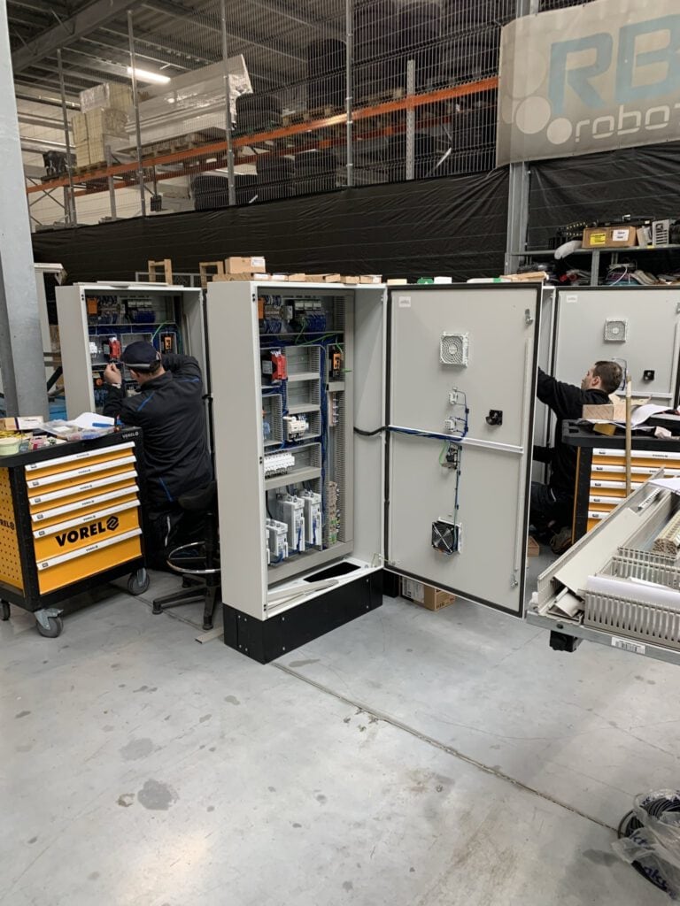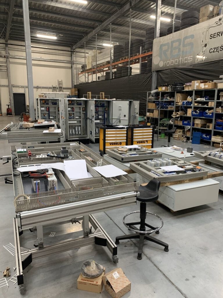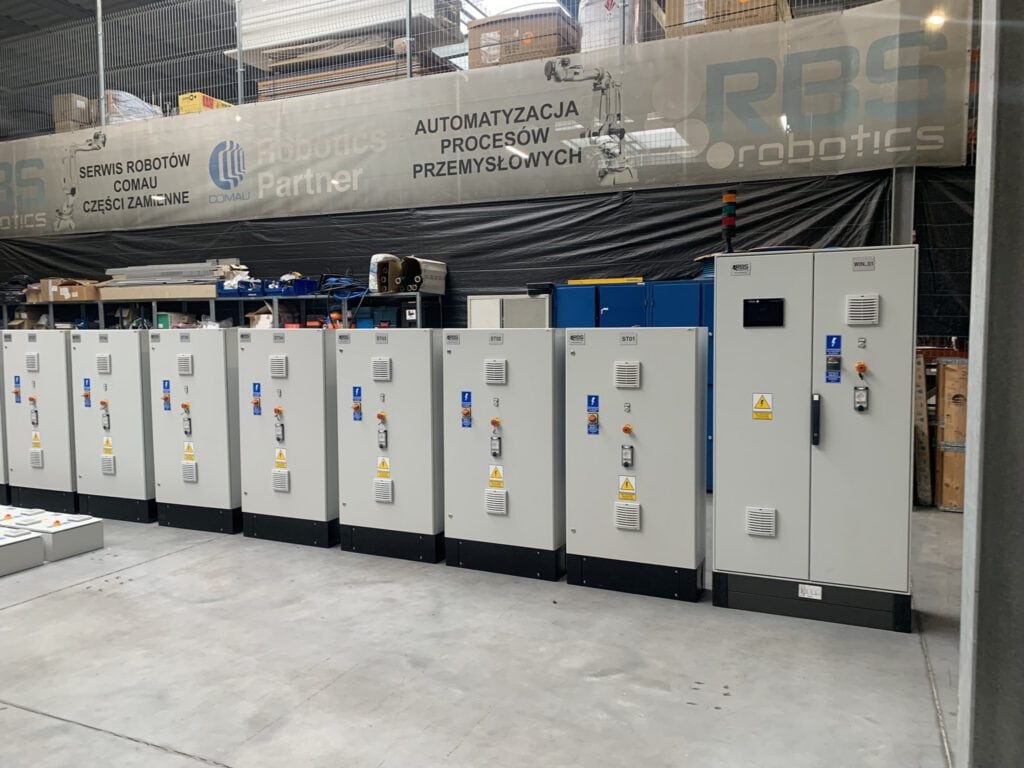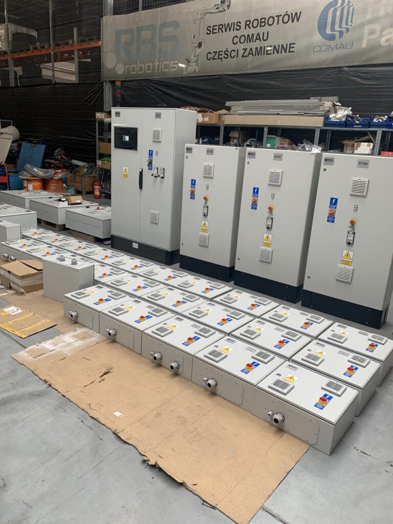 Kilkadziesiąt szaf sterowniczych i krosowych wykonanych, a wcześniej zaprojektowanych przez RBS Robotics do sterowania wielopoziomowym układem przenośników transportu produktów dla dużego producenta z branży spożywczej. Do naszego zakresu prac należało również programowanie PLC, wykonanie wizualizacji procesu (wykorzystano sterowniki i panele operatorskie Siemens) oraz uruchomienie całego układu wraz z asystą produkcyjną.